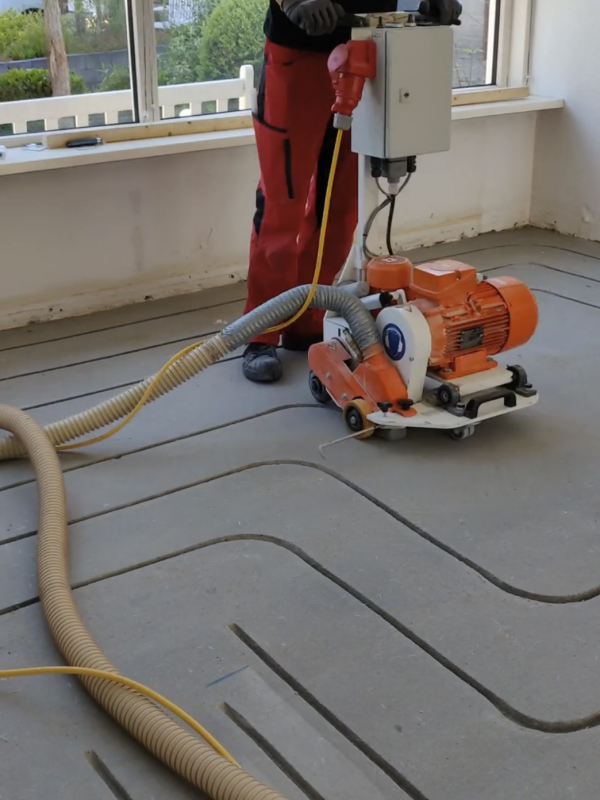 - 02 Frezowanie kanałów W wylewce frezowane (wycinane) są kanały, w których zostaną później umieszczone rury grzewcze. Frezarka obsługiwana jest przez operatora , który przesuwając maszynę po powierzchni podłogi, wycina równe rowki w wylewce. Proces nie generuje pyłu, gdyż podczas pracy maszyny jest on sukcesywnie pochłaniany.